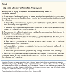 An expert panel of clinicians and investigators concerned with immediate hypersensitivity reactions proposed criteria for the diagnosis of anaphylaxis (Table 2).[6] These criteria include an acute onset of illness, within minutes to hours, associated skin or mucosal involvement with hives, pruritus, or fl ushing, and either respiratory symptoms, such as dyspnea, wheezing, or bronchospasm, or a circulatory component with reduced blood pressure. Specifically, a systolic blood pressure of 90 mm Hg or less, or a 30% decrease in systolic blood pressure, qualifies as a criterion for the diagnosis of anaphylaxis.
