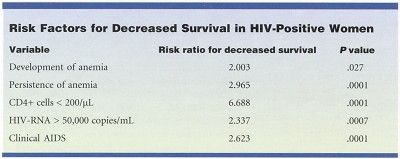 "When you look at all the known risk factors for decreased survivalsuch as low CD4 cell counts, high HIV RNA levels, or history of clinical AIDSthen add anemia into that mix, it turns out that anemia as an independent risk factor is equally important," Dr. Levine said (see Table).