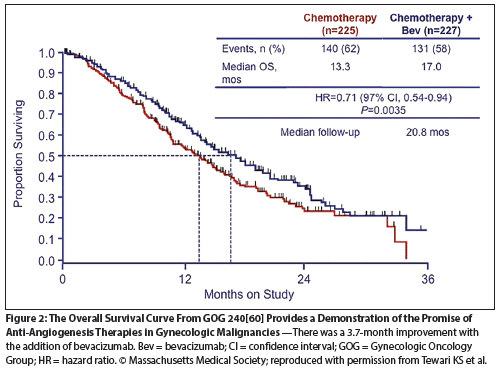Figure 2: The Overall Survival Curve From GOG 240[60] Provides a Demonstration of the Promise of Anti-Angiogenesis Therapies in Gynecologic Malignancies