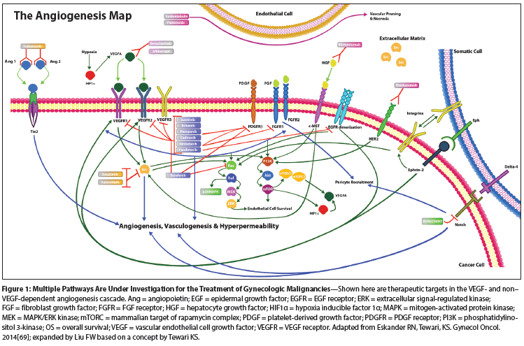 Each year, more than 91,700 new cases of gynecologic malignancies are diagnosed in the United States, and more than 28,000 women lose their lives to gynecologic cancer.[1] Until recently, treatment paradigms in gynecologic oncology have mainly included a combination of radical surgery, cytotoxic chemotherapy (CT), and radiation therapy. Angiogenesis, the recruitment of new blood vessels from the pre-existing vascular matrix, is now a well-established prerequisite for tumor progression. Growth factors such as fibroblast growth factor (FGF), vascular endothelial cell growth factor (VEGF), and angiopoietin-1 (Ang1) are upregulated to stimulate angiogenesis, while downregulation of endogenous protein inhibitors (thrombospondin 1 and interferon) disrupts the balance of physiologic angiogenesis. These events are influenced by and activate other molecular pathways, including phosphatidylinositol 3-kinase (PI3K), mammalian target of rapamycin (mTOR), and mitogen-activated protein kinase (MAPK),[2] and therapies are now available that target these pathocellular processes.