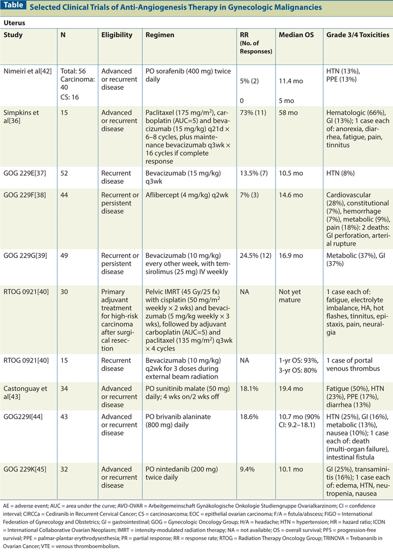 Table (Uterus): Selected Clinical Trials of Anti-Angiogenesis Therapy in Gynecologic Malignancies