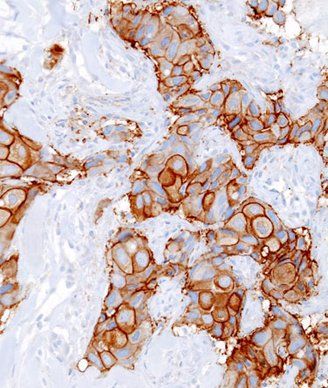 Invasive ductal carcinoma of the breast representing a scirrhous growth. Core needle biopsy. HER-2/neu oncoprotein expression by Ventana immunostaining system. Source: KGH, Wikimedia Commons