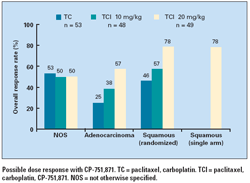 In the randomized phase II trial among patients with locally advanced or metastatic NSCLC, 97 patients were assigned to a TCI arm-paclitaxel, carboplatin, and the investigational CP-751,871 antibody (Pfizer) in a higher or lower dose-and 53 patients were assigned to a TC arm (paclitaxel and carboplatin).