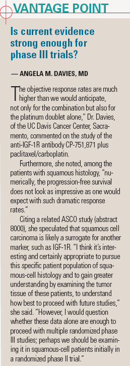 An antibody to the insulin-like growth factor type 1 receptor (IGF-1R), when given with chemotherapy, is active as first-line therapy in advanced non-small-cell lung cancer, especially squamous type, finds the first trial to test an IGF inhibitor in lung cancer. Daniel D. Karp, MD, of M.D. Anderson Cancer Center, reported the trial results at ASCO 2008 (abstract 8015).