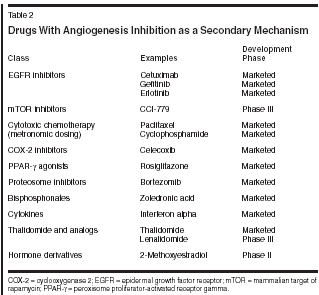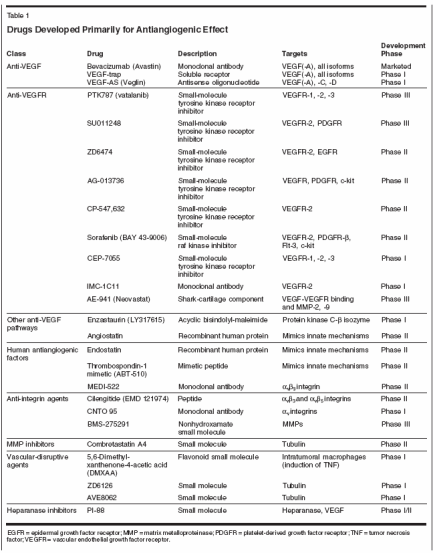 There is substantial preclinical and clinical evidence that angiogenesisplays a role in the development of tumors and the progression ofmalignancies. Inhibiting angiogenesis has been shown to suppress tumorgrowth and metastasis in many preclinical models. These benefitshave translated to the clinic with both marketed and investigationalantiangiogenesis agents. The most prominent target of these compoundsis vascular endothelial growth factor (VEGF) and its receptors. However,several other factors are of interest as well. These include integrins,matrix metalloproteinases, and endogenous antiangiogenic factors. Datafrom late-stage clinical trials support the role of antiangiogenic agents incancer therapy and the significant role that VEGF plays in angiogenesis.Future research will focus on determining the tumor types and stages thatwill benefit most from antiangiogenic therapy and combining therapiesthat target different factors in the angiogenesis pathway.