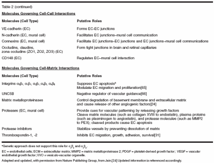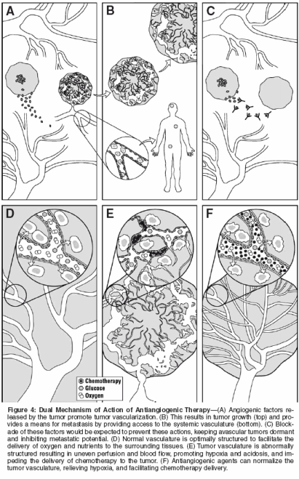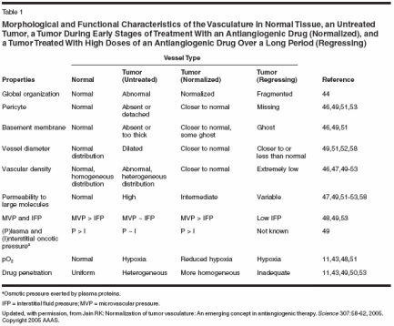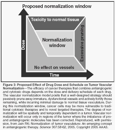 To reconcile these contrasting effects of antiangiogenic therapy, in 2001 I proposed another mechanism of antiangiogenic therapy-normalization of pathologic tumor vasculature by antiangiogenic therapy[12]-and have recently summarized compelling evidence in support of this new concept.[ 13] This theory proposes that normalization occurs because antiangiogenic agents transiently restore the balance of pro- and antiangiogenic factors. By normalizing the structure and function of the tumor vasculature, chemotherapeutic agents and oxygen can be more effectively delivered to the tumor, resulting in improved chemotherapy delivery and radiotherapy sensitivity. While this mechanism is a relatively new concept, it appears to explain the pronounced clinical benefit observed with blockade of VEGF in conjunction with standard chemotherapy.[10] Of interest, there is now increasing evidence in the literature for vascular normalization as a result of VEGF blockade, both in preclinical[11,43- 52] and clinical studies.[53] A clinical study in patients with rectal cancer showed that bevacizumab decreased tumor microvascular density, vascular volume, and IFP.[53] The lack of a concurrent decrease in the uptake of radioactive FDG in these tumors suggested that the normalized vessels were more efficient at delivering these agents to the tumor parenchyma when treated. The reductions in tumor vascular density and permeability were consistent with another study in patients with colorectal cancer treated with an inhibitor of the VEGF receptor tyrosine kinase 2.[54] Unfortunately, in the latter study, there were no measurements of IFP or vessel wall structure to draw any conclusions about vessel normalization. It is important to note that following antiangiogenic drug delivery, a specific time window exists during which vascular normalization occurs. In a murine study that evaluated an antibody to VEGF receptor 2, this normalization window lasted for about 6 days and was characterized by increased tumor oxygenation and vessel pericyte coverage.[51] Consistent with the concept of a normalization window, a recent study showed a transient increase in tumor oxygenation and radiation response of a murine fibrosarcoma when animals were treated with thalidomide (Thalomid), an agent that blocks VEGF and bFGF signaling.[43] Thus, future research must focus on identifying the optimal timing of administration of antiangiogenic agents with chemotherapy or radiation to maximize the benefits that may be attained during this crucial time period (Figure 3). Finally, emerging data show that some cancer cells harbor the receptors for growth factors modulating angiogenesis, and thus may be a direct target of some antiangiogenic agents. For example, some cancer cells express VEGF receptors,[55-57] and ligation of these receptors induces tumor cell proliferation.[57] Blockade of these receptors inhibits VEGFinduced proliferation, providing a mechanism by which some antiangiogenic agents could have direct inhibitory effects on tumor cells. In summary, current data support two key mechanisms of antiangiogenic therapy: (1) inhibition of new vessel formation inside the tumor, and (2) pruning nascent vessels and normalizing the remaining tumor vasculature (Figure 4). Clinical data to date suggest that the latter mechanism may be a key driver of the clinical benefit of combined antiangiogenic and cytotoxic therapies. Future Directions in Antiangiogenic Therapy Angiogenesis is a complex process involving an increasing number of molecular players (Table 2). In addition, there is a likelihood of redundancy in the system and various factors may be critical at different times during vascular development. Because of its critical role in tumor angiogenesis, current therapy has focused largely on blockade of VEGF. Future angiogenic therapy may target VEGF in addition to other angiogenic factors. For example, it has recently been found that the anti-HER2 antibody trastuzumab (Herceptin) blocks multiple angiogenic pathways[58]; combination bevacizumab and trastuzumab therapy is currently in clinical trials. As these combination antiangiogenic therapies are developed, it will be important to balance the benefit of complete angiogenic blockade with any safety concerns that may arise from a potentially too-effective blockade (eg, impaired wound healing, adverse effects in kidneys, thyroid, lung, brain, and heart). Judicious administration of antiangiogenic agents may provide a viable strategy in which multiple pathways are targeted but the blockade does not induce toxic effects. The optimal dosing of antiangiogenic therapy is another key issue for further research. Preclinical data suggest that the concept of using the maximum tolerated dose may not apply in this setting. In some studies the blockade of VEGF activity resulted in adverse effects on normal vessels in multiple organs.[37-40] In addition, some early dose-escalating clinical studies of VEGF blockade suggest that increasing the dose increases toxic effects, which may be directly related to antiangiogenic activity.[7,8] However, large-scale trials must be completed before any conclusions can be drawn. Finally, as clinical development of antiangiogenic agents continues, it may be necessary to reconsider standard metrics of clinical response. Early data suggest that these agents are primarily cytostatic. Thus a greater emphasis on patient survival relative to objective response may be a more appropriate way to evaluate the efficacy of these therapies. In addition, measurement of surrogate markers for functional blockade of angiogenic factors (eg, tumor IFP, blood flow, permeability, vascular density, pericyte coverage, circulating endothelial cells) is critical to optimize the dose and schedule of antiangiogenic agents and cytotoxic therapies. Conclusions Neovascularization is an important physiologic process that enables the growth and metastasis of malignant tumors. This process is tightly reg