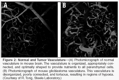 We have known for nearly a century that tumors induce growth of new blood vessels.[ 1,2] In 1971, Folkman proposed that blocking angiogenesis should be able to arrest tumor growth.[3] A few years later, Gullino demonstrated that cells in precancerous tissue acquire angiogenic capacity on their way to becoming cancerous, and thus proposed that inhibition of angiogenesis be used to prevent cancer.[4] In the past 3 decades our understanding of angiogenesis in general, and tumor angiogenesis in particular, has grown exponentially, culminating in the approval of the first antiangiogenic agent, bevacizumab (Avastin), for the treatment of advanced colorectal cancer and spawning more than 60 clinical trials using a variety of antiangiogenic agents.[5,6] The widely accepted mechanism of action of antiangiogenic therapy is that these agents prevent the growth and metastasis of tumors by inhibiting the formation of new vessels. While this notion holds true, data from randomized clinical trials show that when used as monotherapy, currently available antiangiogenic agents produce modest objective responses and do not yield long-term survival benefit in patients with solid tumors.[7-9] However, when given in combination with chemotherapy, bevacizumab, an antibody directed against vascular endothelial growth factor (VEGF), produced unprecedented increases in survival (5 months) in patients with metastatic colorectal cancer.[10] These data support the earlier predictions of Teicher, who postulated that combined administration of antiangiogenic therapy and cytotoxic (chemotherapy and radiation) therapy would yield maximum benefit because such combinations would destroy both compartments in tumors: the cancer cells and the endothelial cells.[11] However, this theory seems paradoxical. If antiangiogenic agents destroy the tumor vasculature, the delivery of chemotherapeutic agents and oxygen to the tumor would be compromised, resulting in less cytotoxicity and radiation resistance. The emerging concept of vascular normalization provides researchers with a potential resolution to this paradox: this hypothesis posits that judicious application of antiangiogenic agents can improve the function of tumor vasculature and thus improve the delivery of oxygen and drugs to tumor cells.[12,13] Here I review this emerging counterintuitive concept and the currently well-accepted view that antiangiogenic therapy inhibits neovascularization, as well as the importance of optimizing the dose and sequencing of these therapies.