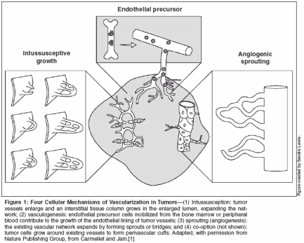Role of Angiogenesis in Tumor Progression In adults, normally occurring neovascularization is largely limited to female reproductive organs and healing wounds. Otherwise, adult neovascularization occurs as a result of a pathologic situation, such as cancer. Although tumors can initially coopt normal blood vessels to support growth, a new blood supply is required for the tumor to grow beyond 1 to 3 mm. This concept has been firmly established by many supported studies and is well illustrated by a study that found numerous small thyroid gland tumors in individuals who died of other causes.[14] Prior to the development of tumor vasculature, tumors are dormant.[15] For angiogenesis to occur, the effect of proangiogenic factors must outweigh the effect of the antiangiogenic factors. When the balance tips towards proangiogenesis, the tumor undergoes what has been described as the angiogenic switch, which fosters the development of new vessels and allows tumor progression to ensue.[ 16] Further, once angiogenesis is prompted, tumors become invasive locally and systemically. Evidence for the critical and pathologic role that angiogenesis plays in cancer progression comes from studies demonstrating that microvessel density within the tumor-the number of blood vessels in a defined area-is not only prognostic in some tumor types, but also correlates with the development of metastases.[17] Mechanisms of Angiogenesis At least four cellular mechanisms can result in the vascularization of tumors: co-option, intussusception, sprouting (angiogenesis), and vascu- logenesis (Figure 1). Tumor cells can co-opt and grow around existing vessels to form perivascular cuffs. However, these cuffs cannot grow beyond the diffusion limit of critical nutrients, and may actually cause the collapse of the vessels due to the compressive forces generated by tumor cell growth (referred to as solid stress). Alternatively, an existing vessel may enlarge in response to the growth factors released by tumors, and an interstitial tissue column may grow in the enlarged lumen and partition the lumen to form an expanded vascular network. This mode of intussusceptive microvascular growth has been observed during tumor growth, wound healing, and gene therapy.[18-21]