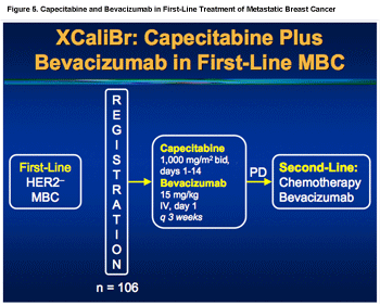 Another trial of first-line bevacizumab with chemotherapy has been recently reported by Sledge et al.21 (See Figure 5.) Known as the XCaliBr trial, it included 106 patients with metastatic breast cancer given capecitabine at a dose of 2,000 mg/m2 divided twice daily (14 days on, 7 days off) and bevacizumab at 15 mg/kg every 3 weeks. Eligible patients had HER2/neu-negative disease and no prior chemotherapy except in the neoadjuvant/adjuvant setting at an interval of more than 6 months.