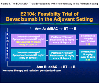 With the benefit of bevacizumab demonstrated in ECOG 2100, a phase II study (ECOG 2104) has been conducted to evaluate the feasibility of bevacizumab in the adjuvant setting. Patients in study arm A receive dose-dense doxorubicin (Adriamycin)/cyclophosphamide (AC) along with bevacizumab followed by paclitaxel with bevacizumab, and then by bevacizumab alone. Patients in arm B also start with dose-dense AC but without bevacizumab, followed (as in arm A) by paclitaxel and bevacizumab, and then by bevacizumab alone, but for more cycles than in arm A. (See Figure 6.) Based on the result of this trial, a subsequent randomized phase III trial (ECOG 50103) will be opening to evaluate contributions of bevacizumab to adjuvant AC (every 2 weeks or every 3 weeks) followed by paclitaxel.