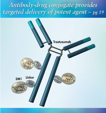 As shown in the cover image, the antibody-drug conjugate trastuzumab-DM1 (T-DM1) consists of ImmunoGen's potent cell-killing agent DM1 (derived from maytansine) attached by a chemical linker to Genentech's HER2-binding monoclonal antibody, trastuzumab (Herceptin). This creates a so-called armed antibody. T-DM1 is in development by Genentech, which provided the illustration.