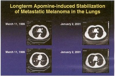 Of the nine patients in the trial with melanoma, three achieved stable disease. In one 63-year-old man, stabilization of pulmonary metastases has continued for 33 months and 41 cycles of Apomine (see Figure for two views). Before entering the Apomine trial, the patient had undergone five chemotherapy regimens for his melanoma. He continues to receive Apomine on a schedule of 50 mg twice daily for 14 days every 21 days.