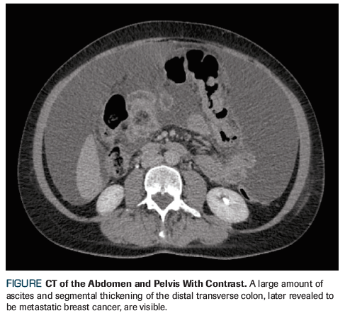 Recently, the patient developed increasing abdominal pain, bloating, and constipation with smaller-caliber stools. Abdominal CT showed a mass in the transverse colon with ascites and peritoneal nodularity (Figure). No obvious liver metastasis or cirrhosis were present. Colonoscopy was attempted, but the stricture resulting from the colon mass was unable to be traversed. A palliative exploratory laparotomy with subtotal colectomy was performed due to impending complete obstruction. The pathology report revealed infiltration of poorly differentiated carcinoma-most consistent with breast primary-in the sampled small intestine, large intestine, appendix, and mesentery. Margins were positive. Immunologic stains were positive for mammaglobin, GATA binding protein 3 (GATA-3), and cytokeratin 7 (CK7). The sample was positive for ER (3+, 90%) and PR (3+, 5%) but negative for HER2. Following surgery, the patient’s normal bowel function returned, and she was referred to oncology for treatment of her newly diagnosed metastatic breast cancer.