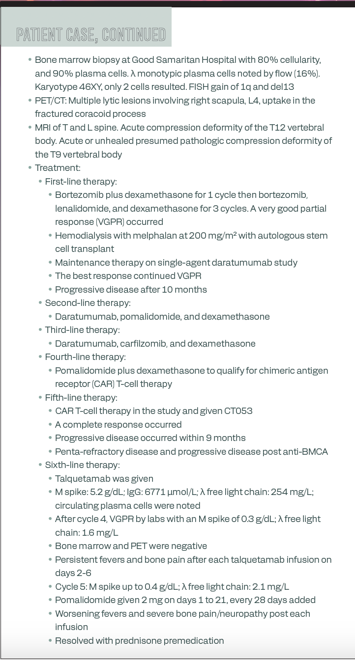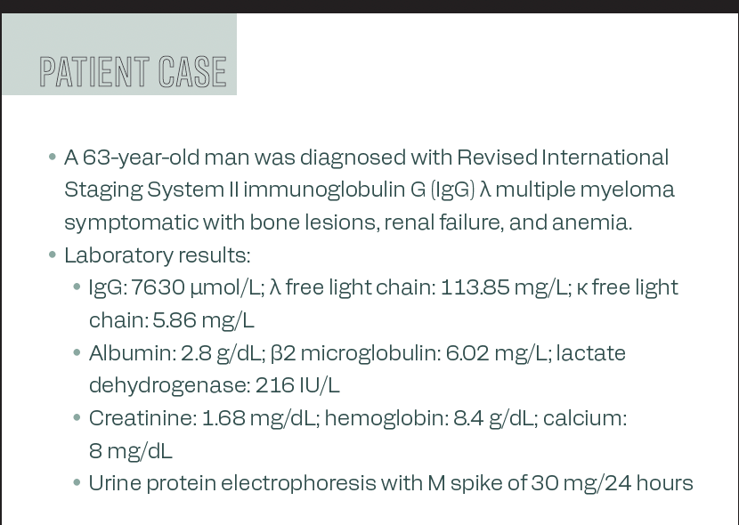 As the case was being presented, Mikhael questioned whether bridging occurred during the 6 lines of treatment outlined. Gregory noted that she was only able to go back to using pomalidomide (Pomalyst) plus dexamethasone. She did highlight that she had never had a patient hit a complete response and then continue to progression 9 months later, which was “unusual” to her.