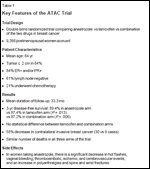 The ATAC trial is the only adjuvant trial of a new aromatase inhibitor that has been published so far.[5] This large multinational double-blind placebo-controlled trial began in July 1996 and ended accrual in March 2000. The aim of the trial was to compare the efficacy and sideeffect profile of 5 years of anastrozole (1 mg po qd), tamoxifen (20 mg po qd), and the combination of tamoxifen and anastrozole in the management of postmenopausal women with earlystage breast cancer.