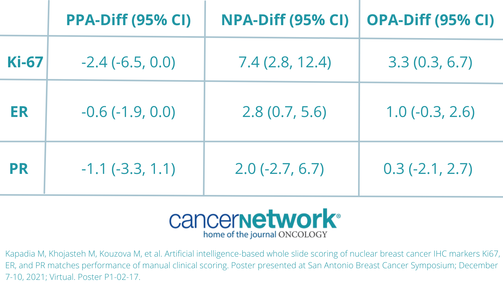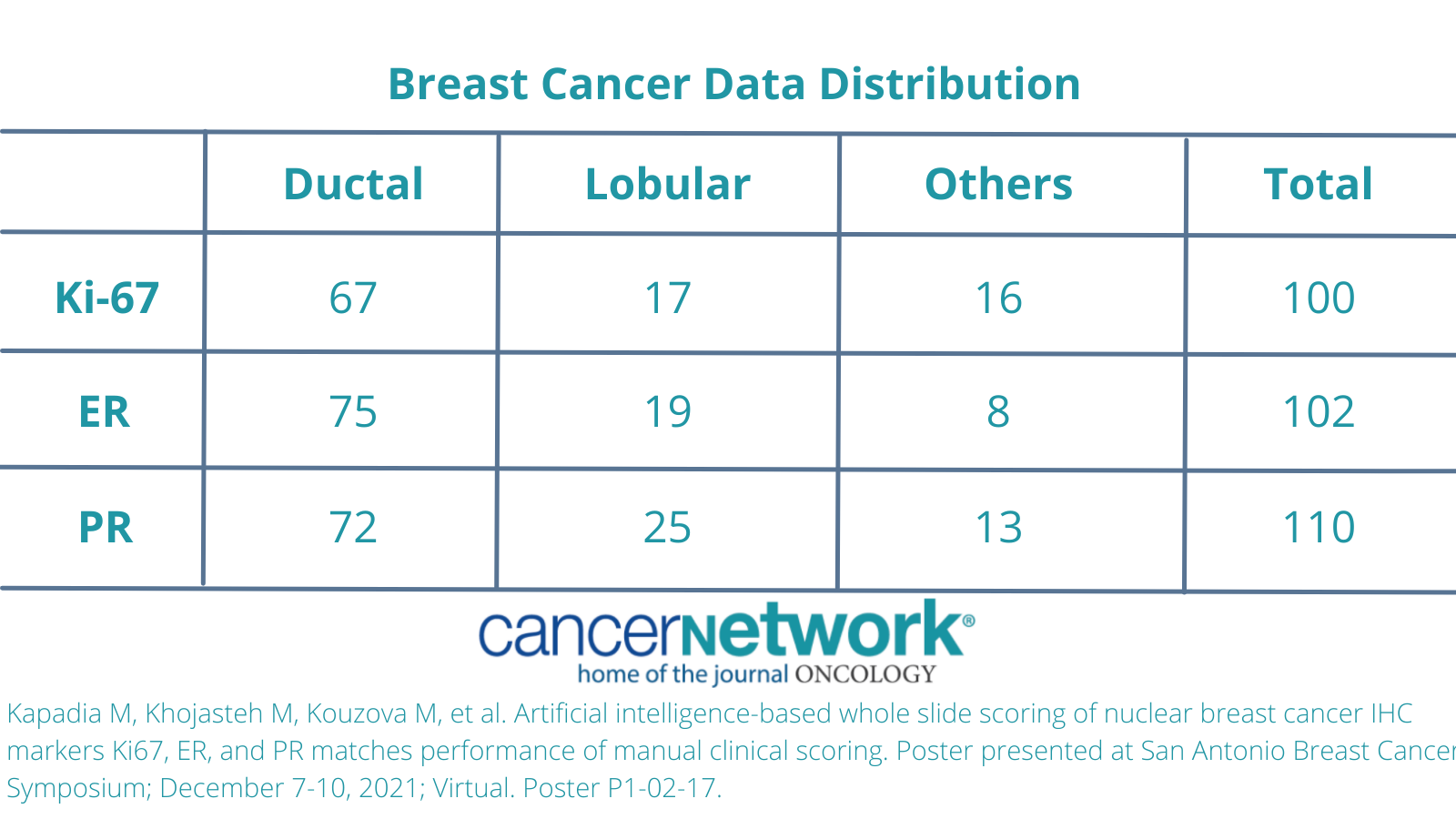 Kapadia M, Khojasteh M, Kouzova M, et al. Artificial intelligence-based whole slide scoring of nuclear breast cancer IHC markers Ki67, ER, and PR matches performance of manual clinical scoring. Poster presented at San Antonio Breast Cancer Symposium; December 7-10, 2021; Virtual. Poster P1-02-17.