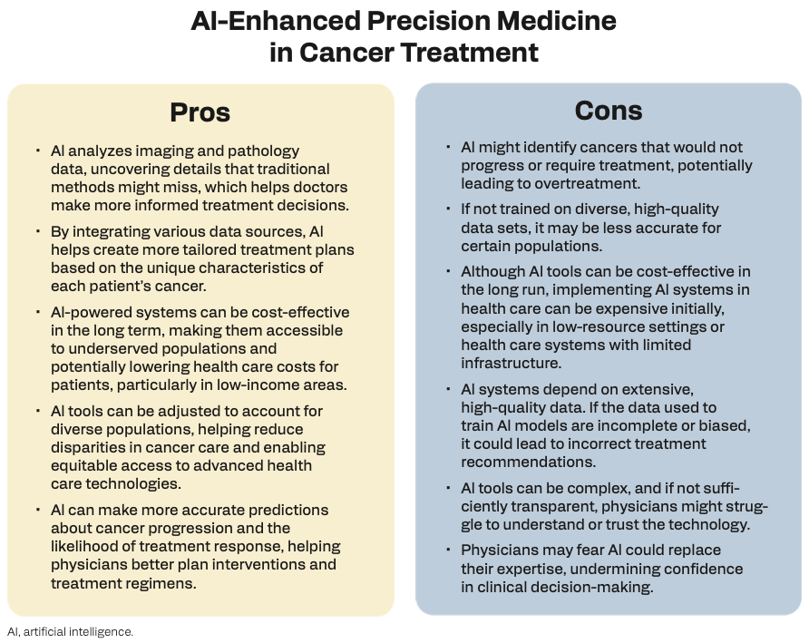 FIGURE 2. AI-enhanced precision medicine improves cancer detection, treatment outcomes, and personalization by analyzing imaging and pathology data, offering more accurate predictions and reducing health care disparities. However, current drawbacks include the risk of overdiagnosis, potential bias due to lack of diverse data,high initial costs, and concerns over trust and complexity among health care providers.