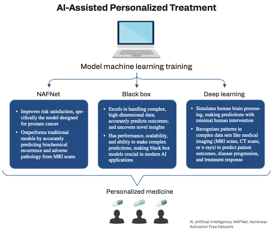 FIGURE 1. AI-driven personalized treatment, leveraging models like NAFNet, is improving prostate cancer risk stratification by accurately predicting biochemical recurrence and adverse pathology from MRI scans. NAFNet outperforms traditional models in these areas. Black box models, which learn from vast data to identify patterns, are essential for making complex predictions and uncovering novel insights. Deep learning, simulating human brain processing, excels at recognizing patterns in complex medical data like MRI and CT scans, allowing for precise predictions of patient outcomes, disease progression, and treatment responses.