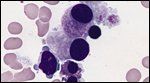 Bone marrow smear from a patient with RAEB and an isolated 5q-chromosome abnormality showing two small megakaryocytes with nonlobulated nuclei. The cytoplasm is well granulated.