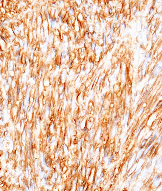Histopathologic image of GIST arising in the stomach; CD34 immunostain