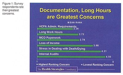 Asked to rate their concerns on a scale of one to five, the respondents put meeting Health Care Financing Administration (HCFA) requirements in first placeahead of long work hours, managed care organization paperwork, loss of income, stress in dealing with death and dying, and internal audits. (See Figure 1.)