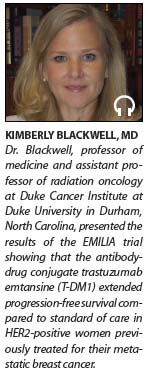 The primary endpoint of progression-free survival was met, and the absolute improvement in median progression-free survival was about 3.2 months. Now that in itself is always very exciting. . . . I think anytime we see a treatment option that improves outcome, people’s ears perk up and we all start thinking about when the drug becomes available, how we are going to use it. Probably the second most exciting finding in the EMILIA study was that the drug, which is a traditional cytotoxic known as DM1 and bound to trastuzumab, has very little toxicity associated with impact on quality of life and other measures such as grade 3 or greater adverse events. And this is a real proof-of-principle study in that it showed that if you can link a cytotoxin to an antibody and deliver it directly to the cancer cell, then the side effect profile will be quite favorable. We saw an 18% absolute difference in treatment discontinuation due to adverse events. It was higher in the control arm compared to the T-DM1 arm. . . . People are excited, even if they don’t take care of a lot of breast cancer patients, because of the proof of concept that maybe we could lessen the toxicity of chemotherapy by binding it to a tumor-directed antibody