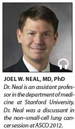 One of the most exciting results I think we saw was from Julie Brahmer, about the PD-1 drug. . . . In a phase I trial including about 100 non–small-cell lung cancer (NSCLC) patients, they saw a response rate of about 18% in heavily pretreated patients, and some of those responses lasted for more than 24 weeks. The drug had fairly low side effects-just a little rash, diarrhea, fatigue, and itching-because it’s an immunotherapy, so really this shows us that moderating the immune system may be a potential target in NSCLC.”