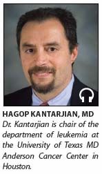 “There were updates of the two front-line randomized studies looking at the second-generation TKIs, nilotinib and dasatinib vs the standard of care, which is imatinib. And in both of these updates the investigators report that the second-generation TKIs continue to show an advantage in terms of the early surrogate endpoints. . . . I think the more important study is the one with ponatinib, which is also a BCR-ABL tyrosine kinase inhibitor, but in contrast to the other two drugs, it is also active against the T315I mutation, which other drugs have not been effective against. . . . the results with ponatinib are very, very impressive. What was seen in the chronic phase, for example, is a complete cytogenetic response rate of 44%, a major cytogenetic response rate of 54%, and a major molecular response rate of 30%. And those responses were durable. With a follow-up of about 10 months, 93% of the major cytogenetic responses were continuing to be there. . . . This drug is also highly effective against the T315I mutation.