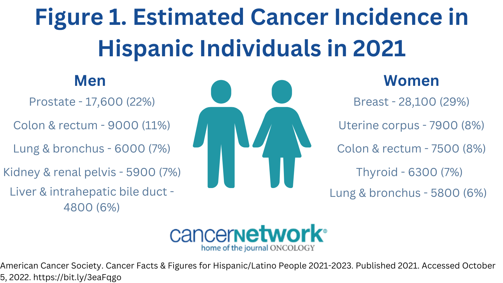 A report from the American Cancer Society estimated that 80,200 new cases of cancer would be diagnosed in Hispanic men plus 96,400 in Hispanic women.1 While the number 1 cause of death in non-Hispanic White individuals is heart disease, the leading cause of death in Hispanic individuals is cancer, with an experts estimating that 23,800 men and 22,700 women will die from cancer in 2021. Notably, lung cancer was reported to be the leading cause of death in Hispanic men and breast cancer in women.