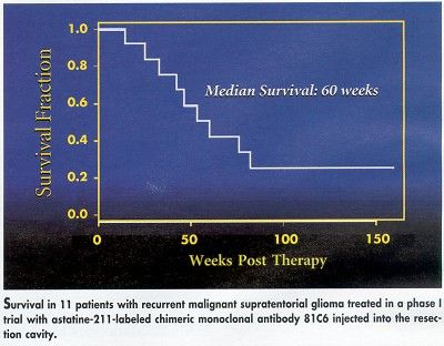 In their first attempt, a phase I study of patients with recurrent glioblastoma multiforme using an iodine-131-labeled antibody, median survival was 52 weeks, a significant improvement over the 16 to 24 weeks typically associated with this condition (Bigner D et al: J Clin Oncol 16:2202-2212, 1998).