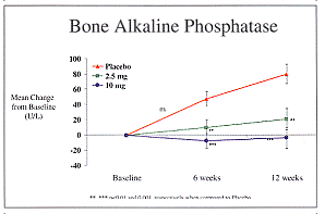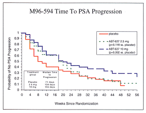refractory prostate cancer who received placebo, 2.5 mg/d of the potent oral endothelin-A receptor antagonist atrasentan (ABT-627), or 10 mg/d of atrasentan. Figure 2 (top right) shows the time to PSA progression from the same study. Figure 3 (left) shows bone alkaline phosphatase levels (a serum marker of bone formation) from two randomized studies (including M96-594) of men with hormone-refractory prostate cancer who received atrasentan, 2.5 mg (n = 135) or 10 mg (n = 137), or placebo (n = 147). Men receiving atra-sentan had significantly lower levels of bone alkaline phosphatase, compared with placebo. Figures 1 and 2 are courtesy of Dr. Michael Carducci, of Johns Hopkins University. Figure 3 is courtesy of Dr. Joel Nelson, of the University of Pittsburgh Medical Center.