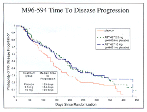 Figure 1 (top left) shows median time to clinical progression (study M96-594) for 244 asymptomatic men with hormone-