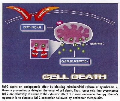 Augmerosen uses antisense technology, he explained, to bind to Bcl-2 messenger RNA. The resultant downreg-ulation of Bcl-2 permits the apoptotic stimulus created by cytotoxic agents to get through to activate the cascade toward cancer cell death (see Figure).