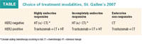 The latest St. Gallen’s guidelines incorporate HER2 status and hormone receptor (HR) status as the primary determinants of treatment allocation. Five patient categories are now recognized: highly endocrine responsive, incompletely endocrine responsive, endocrine nonresponsive, HER2-positive, and HER2-negative. Treatment is assigned accordingly (see Table).