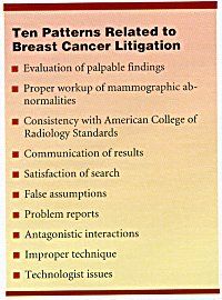In their survey of claims, the Henry Ford Hospital team found 10 patterns accounting for most of the lawsuits. At the top of the list were clinician mistakes in evaluation of palpable findings, improper workup of mammographic abnormalities, and failure to follow American College of Radiology (ACR) guidelines.