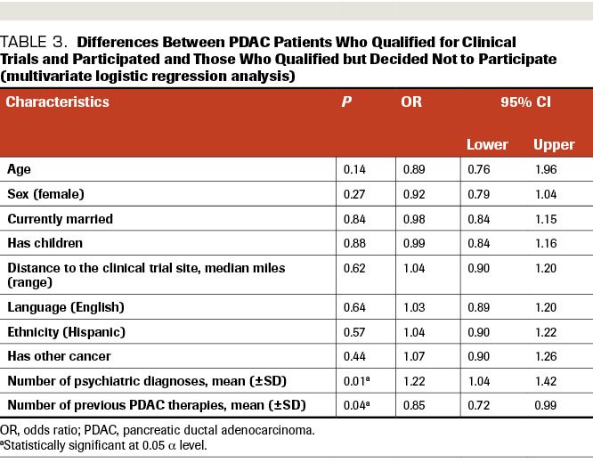TABLE 3: Differences Between PDAC Patients Who Qualified for Clinical Trials and Participated and Those Who Qualified but Decided Not to Participate (multivariate logistic regression analysis)