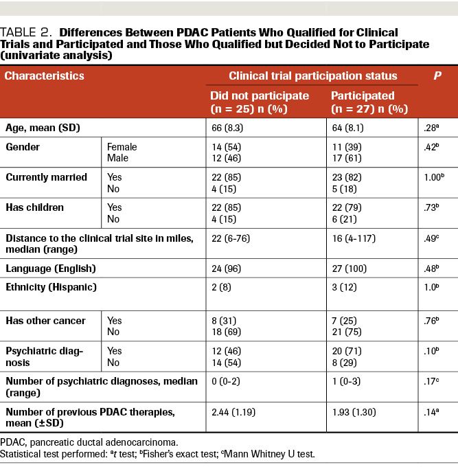 TABLE 2: Differences Between PDAC Patients Who Qualified for Clinical Trials and Participated and Those Who Qualified but Decided Not to Participate (univariate analysis)