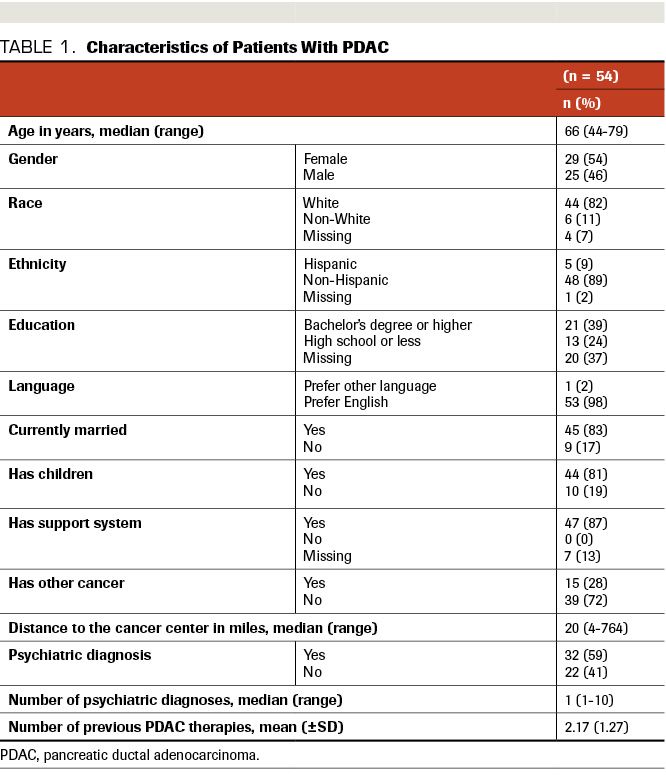 After controlling for age, sex, marital status, children, distance lived from trial site, language preference, ethnicity, and history of prior cancer, 2 factors became statistically significant: the number of prior PDAC therapies received and the number of psychiatric comorbidities (Table 3).