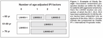Aggressive lymphomas comprise at least four different types of lymphoma: diffuse large B-cell lymphoma (DBLCL), peripheral T-cell lymphomas (PTCL), Burkitt lymphoma, and lymphoblastic lymphoma. Lymphoblastic lymphoma is a rare subtype in adult patients and is currently treated as acute lymphoblastic leukemia, so it will not be considered in this article. Burkitt lymphoma occurs mostly in pediatric patients, but infrequently in adult patients outside of human immunodeficiency virus infection or the posttransplant setting. It poses special problems because of its aggressiveness, particularly in elderly patients. Whereas the treatment of DLBCL has completely changed in recent years with the combination of rituximab (Rituxan) with chemotherapy, no similar immunochemotherapy exists for PTCL and hence the outcome for these patients still needs to be improved. Since 1984, the Groupe d'Etude des Lymphomes de l'Adulte (GELA) has run several studies on aggressive lymphomas that have contributed to the advances made for thetreatment of these patients and to defining the standard care. A summary of principal studies will be presented here with conclusions regarding their implications for the future. Choice of Treatment Since 1987, the GELA has based the choice of treatment on the presence or absence of prognostic factors. Before the description of the International Prognostic Index (IPI),[1] weused the parameters largely used around the world, not differing much from the IPI.[2] Since 1993, as shown in Figure 1, we based all our prospective studies on (1) age and (2) an ageadjusted IPI score, based on the following parameters: stage III/IV, serum lactate dehydrogenase (LDH) level, and performance status. Stage was never considered as a determinant parameter for deciding treatment, but because stage is part of the parameters defining the IPI, patients with localized stage represent a large portion of good-risk patients as defined by the age-adjusted IPI (score 0 or 1).