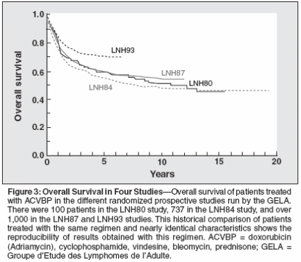 Until the incorporation of rituximab into the treatment of patients with B-cell lymphoma, patients with B-cell and T-cell lymphoma were given the same chemotherapy regimens. In subgroup analyses, the GELA has never found a difference in response to treatment, progression-free survival, or overall survival for any particular location (mediastinal, gastrointestinal, nodal, or extranodal), so all these patients were included in the same studies without any stratification according to involved site (although patients with central nervous system lymphoma were usually excluded from these studies). It was the same for the different histologic entities within the large group of diffuse large B-cell lymphoma. Currently, gene profiling for choosing the treatment of patients is not applicable in prospective studies because the results of such an assay should be obtained within a few days before starting treatment for most patients.[3] The ACVBP Regimen In 1984, some hematologists and oncologists from France and Belgium decided to work together on prospective studies for patients with lymphoma and founded what would become the GELA a few years later. The first attempt at cooperation was based on the LNH84 study[4]-a prospective study where all patients were treated with ACVBP (doxorubicin [Adriamycin], cyclophosphamide, vindesine, bleomycin, prednisone), a dose-dense and dose-intense CHOP (cyclosphosphamide, doxorubicin HCl, vincristine [Oncovin], prednisone)-likeregimen, followed by sequential consolidation (Figure 2).