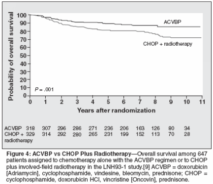 Because this regimen yielded a high response rate and a 5-year progression- free survival rate of more than 50%, it was chosen as the standard regimen to which others would be compared in subsequent randomized studies. Figure 3 shows the overall survival of patients treated with the ACVBP regimen in the successive randomized studies where it was used as the standard arm. More than 3,000 patients were included in these four studies. It shows the reproducibility of the results obtained with this regimen over time and the fact that 5-year survival rate is over 50% in unselected patients. A long-term follow- up has proven its absence of longterm toxicity, particularly a low secondary risk for myelodysplastic syndromes or acute leukemia.[5] Good-Risk Patients Patients with a score of 0 or 1 on the age-adjusted IPI have either localized or disseminated disease with a normal LDH level and good performance status. As shown in Figure 1,the GELA has chosen for a long time to propose different treatment for this group of patients and to stratify between those with no adverse prognostic factors (score of 0 on the age-adjusted IPI) and those with one prognostic factor (score of 1 on the age-adjusted IPI). One of the reasons for this choice was the decision of the GELA to evaluate the benefit of radiotherapy in patients with localized disease. Previously, few randomized studies had tested this benefit. The principal study that merged patients with adverse parameters (age and LDH level) on the IPI concluded the superiority of three cycles of CHOP followed by local radiotherapy over chemotherapy alone with eight cycles of CHOP.[6] Another study with a longer follow- up that compared radiotherapy or nothing in patients treated with CHOP did not show any benefit in favor of the radiotherapy.[7] Because our previous LNH87.1 study of good-risk patients had shown a benefit for the ACVBP regimen over the m-BACOD (methotrexate, bleomycin, doxorubicin [Adriamycin], cyclophosphamide, vincristine [Oncovin], dexametha-sone, leucovorin) regimen[8] (a CHOP-like regimen that was thought to be superior to CHOP at the time), ACVBP was chosen as the comparator to CHOP plus radiotherapy in our LNH93-1 study.[9]