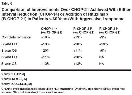As shown by the results of the NHL-B2 trial of the DSHNHL[3] and the GELA LNH-98.5 trial,[30] both dose densification (ie, reduction of treatment intervals from 3 to 2 weeks)[3] and the addition of rituximab to 3-weekly CHOP-21[30] can improve treatment outcome compared to the former standard CHOP-21 to a similar extent (Table 6). Even though there is no direct comparison between CHOP-14 and R-CHOP-21 available yet, one can assume equal efficacy and toxicity for CHOP-14 and R-CHOP-21. With CHOP-14 and R-CHOP-21 being apparently equally well tolerated and efficacious, due to the lower cost of G-CSF (which is mandatory for CHOP-14) compared to eight applications of rituximab in R-CHOP- 21, we consider CHOP-14 the best and most cost-effective treatment for elderly patients with DLBCL. The economic aspect gains additional support from the fact that 30% of the RCHOP- 21 patients in the GELA trial received G-CSF in addition to eight cycles of rituximab. However, because neither the CHOP-14 nor R-CHOP- 21 results are satisfactory, we encouragetreatment of elderly patients within clinical trials in an attempt at further improvement. Perspectives