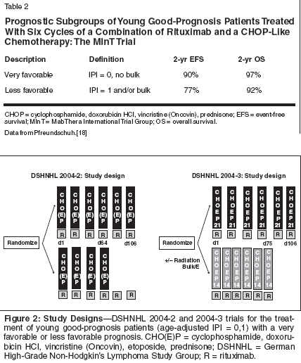 A multivariate analysis of the MInT results[18] revealed, in the treatment arm with rituximab, the presence of bulky disease and one risk factor according to the IPI as highly significant prognostic factors. Patients with IPI = 0 and no bulky disease after R-CHEMO represent a very favorable subgroup with a 2-year event-free survival of 90%, while patients with ageadjusted IPI = 1 and/or bulky disease represent a less favorable subgroup with only 77% 2-year event-free survival. The respective figures for 2-year overall survival are 90% and 97%, respectively. Notably, the results in the very favorable group were achieved with six cycles of a CHOPlike chemotherapy with rituximab andwithout radiotherapy, while in the less favorable group bulky disease was a negative prognostic factor despite radiotherapy given to such areas. Thus, in the era of combined rituximab CHOP-like chemotherapy, two novel therapeutic subgroups have evolved for young good-prognosis patients (Table 2). In the very favorable subgroup (IPI = 0, no bulk) further improvement will be difficult to achieve and demonstrate, but the results in the less favorable subgroup definitely warrant further improvement. The results in the very favorable subgroup suggest that a considerable proportion of patients are overtreated. We therefore have designed a trial that compares six cycles of a CHOP-like regimen combinedwith six cycles rituximab with four cycles of the same CHOP-like regimen combined with six applications of rituximab. For the less favorable group, we aim at improving the results further. This will be attempted in a randomized trial that compares six cycles of CHOEP-21 with rituximab with a dose-dense regimen of six cycles of CHOEP-14 with rituximab (Figure 2). Young Poor-Prognosis PatientsBackground