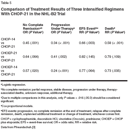 The trials of the British National Lymphoma Investigation demonstrated that elderly patients, particularly those > 70 years, cannot be cured by radiotherapy alone,[31] even if they have limited stage I disease. Becausein the GELA trial LNH93-4 patients above 70 years of age with IPI = 0 who received radiotherapy in addition to four cycles of CHOP-21 had a worse overall survival than those who did not,[32] radiotherapy should be used cautiously and not outside clinical trials for elderly patients. As in young patients, six to eight cycles of CHOP given every 3 weeks was the standard chemotherapy regimen for more than 25 years, and was confirmed for the elderly in the randomized Intergroup trial with nearly 900 eligible patients enrolled,[14] nearly half of whom were > 60 years of age. In randomized trials that were particularly designed for elderly patients, a variety of modifications of the CHOP regimen-dose-reduced weekly application of CHOP, 50% dose-reduced first cycle, and dose-modified schedules omitting anthracyclines or substituting doxorubicin with mitoxantrone- came out with disappointing results. Therefore, classic CHOP given every 3 weeks (CHOP-21) remained the gold standard in aggressive lymphoma treatment until the recent publication of the results of three large randomized trials conducted by the German DSHNHL,[3,17] the French GELA,[30] and the American ECOG[33] that had been specifically designed for elderly patients. After the publication of the Intergroup study,[14] the DSHNHL decided to evaluate two different strategies in order to improve the outcome of patients that do not qualify for high-dose chemotherapy. Coapplication of granulocyte colony-stimulating factor (G-CSF, filgrastim [Neupogen]) allows the shortening of treatment intervals of the CHOP regimen from 21 to 14 days (CHOP-14) without adding toxicity, and results in a significant increase of dose density without compromising the total dose given. As an alternative, etoposide, a cytotoxic drug with proven activity in relapsed lymphomas, can be added to CHOP (CHOEP regimen) and results in an escalation of the total dose of cytotoxic drugs. Furthermore, CHOEP-14, in which both strategies (dose escalation and dose densification) are combined, proved to be feasible in a pilot study.[34] In the NHL-B2 trial of the DSHNHL, 689 elderly patients were randomized between 1993 and 2000 to receive six cycles of either a 3-weekly or biweekly CHOP with and without etoposide (CHOP-21, CHOEP-21, CHOP-14, CHOEP-14), respectively. All three intensified regimens (CHOP- 14, CHOEP-21, CHOEP-14) significantly improved outcome compared to CHOP-21 (Table 5), with CHOP- 14 not only inducing the highest remission rate (complete response: 76% vs 60%; P = .001), but also the best 5-year event-free survival (44% vs 33%; P = .003) and 5-year overall survival (53% vs 41%; P < .0001) compared to CHOP-21.