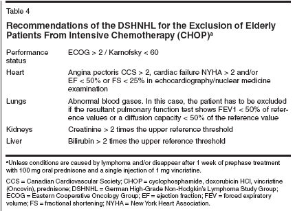 The upper age limit for chemotherapy with curative intention will be defined by the higher comorbidity that is associated with increasing age, rather than by the chronologic age of a patient. As a consequence, a careful and repeated evaluation of preexisting or concomitant diseases evolving under therapy and comorbid conditions is absolutely mandatory in elderly patients (Table 4). Background