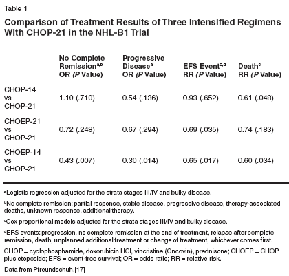 17. Pfreundschuh M, Trümper L, Kloess M, et al: Two-weekly or 3-weekly CHOP chemotherapy with or without etoposide for the treatment of young patients with good-prognosis (normal LDH) aggressive lymphomas: Results of the NHL-B1 trial of the DSHNHL. Blood 104:626-633, 2004.