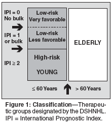 2. Young poor-prognosis patients (age-adjusted IPI ≥ 2) 3. Elderly patients More recent prognostic classifications are based on gene expression profiles as determined by the microarray technique. Several investigatorshave shown that gene expression profiles have prognostic significance independent from the IPI. The value of the gene expression-based prognostication has to be confirmed in prospective trials, which is demanding, because to date fresh biopsy material is the prerequisite for gene expression analysis and the method is available and reliable in only a few laboratories worldwide. Even though analysis of a limited number of genes might have a similar prognostic power[4] and good correlations between the expression of a few relevant genes at the mRNA level and at the protein level (by immunohistology) have been demonstrated,[5] the IPI is still the most widely applicable prognosticator within the context of a large cooperative group with 300 participants like the DSHNHL. Therefore, for the time being, prognostic classification based on clinical parameters determines the therapeutic strategies of the DSHNHL. Young Good-Prognosis PatientsBackground