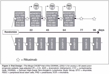 The currently available data make it evident that in the group of young poor-prognosis patients there is no formal proof that any of the morerecent approaches that have been successful in elderly patients or young good-prognosis patients can also improve the outcome of young poorprognosis patients. In light of the experiences in young low-risk patients, where the interval reduction from 3 to 2 weeks and the addition of etoposide (CHOEP-14) improved complete response, event-free survival, and overall survival rates, and the addition of rituximab further improved the outcome of these patients, it is problematic to randomize young poorprognosis patients into a control arm with CHOP-21. Due to the low toxicity of rituximab and its efficacy in young good-prognosis patients, it is difficult not to give this antibody to young poor-prognosis patients, even though its efficacy has not been demonstrated in this subpopulation and is less pronounced in elderly high-risk than elderly low-risk patients.[30] Because there is no standard therapy for young poor-prognosis patients, we recommend treating all of these patients within randomized prospective trials that compare dose-dense regimens (eg, CHOEP-14) with a maximally escalated high-dose regimen containing the most efficacious drugs for the treatment of aggressive lymphomas (eg, Mega-CHOEP, see Figure 3). For young poor-prognosis patients who are not candidates for or who or are not willing to participate in clinical trials, we believe that a full-cycle dose-dense regimen (eight cycles of CHOEP-14 or four cycles of ABCVP) in combination with rituximab is the best choice. Elderly PatientsGeneral Treatment Considerations