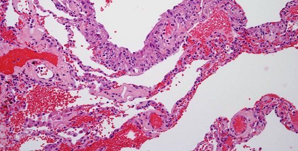 A 42-year-old woman presents with bilateral cystic changes in the lungs. According to the histopathology image below, what is your diagnosis?
