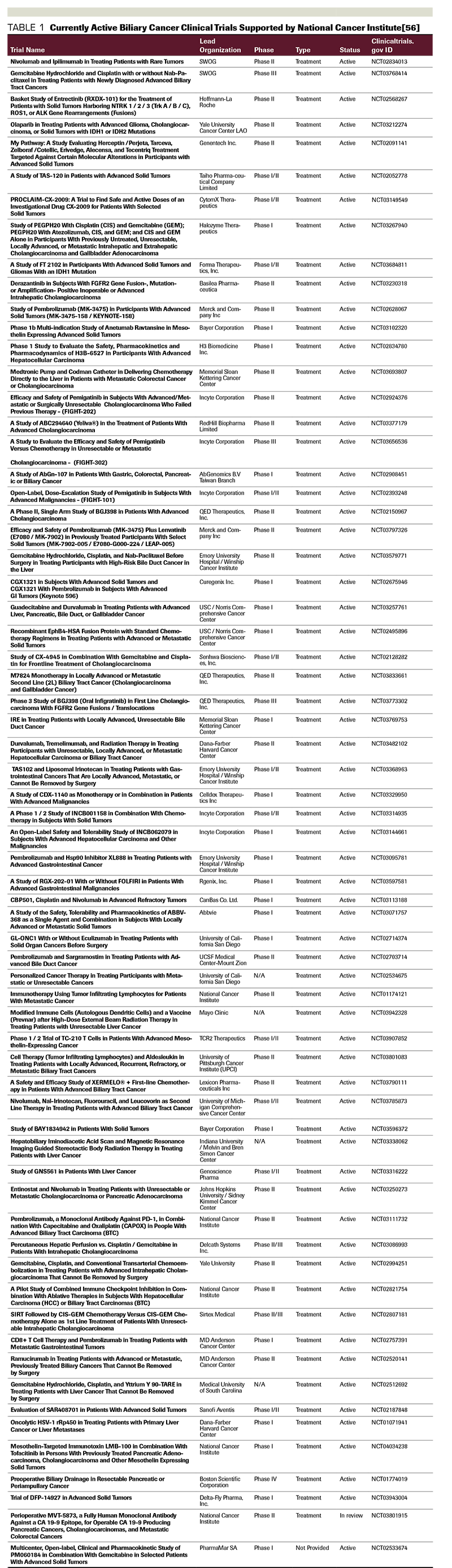 TABLE 1 :Currently Active Biliary Cancer Clinical Trials Supported by National Cancer Institute[56]